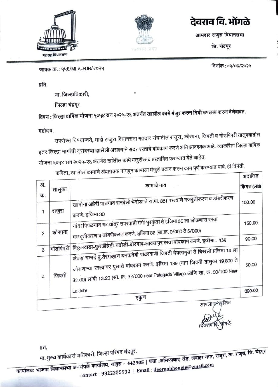 मोठमोठ्या खड्ड्यांमुळे ये जा करणाऱ्या नागरिकांचे हाल होत होते. किरकोळ अपघात ही रोजचीच बाब झाली होती. संतप्त नागरिकांनी अनेकदा आमदार देवराव भोंगळे यांची भेट घेऊन रस्त्याची विक्राळ अवस्था दाखवली. लोकांची मागणी लक्षात घेऊन त्यांनी तातडीने पुढाकार घेत ०५ जुलै २०२५ रोजी जिल्हा वार्षिक योजना ५०५४ अंतर्गत १५० लक्ष रुपयाचा निधीकरिता पत्र दिले.