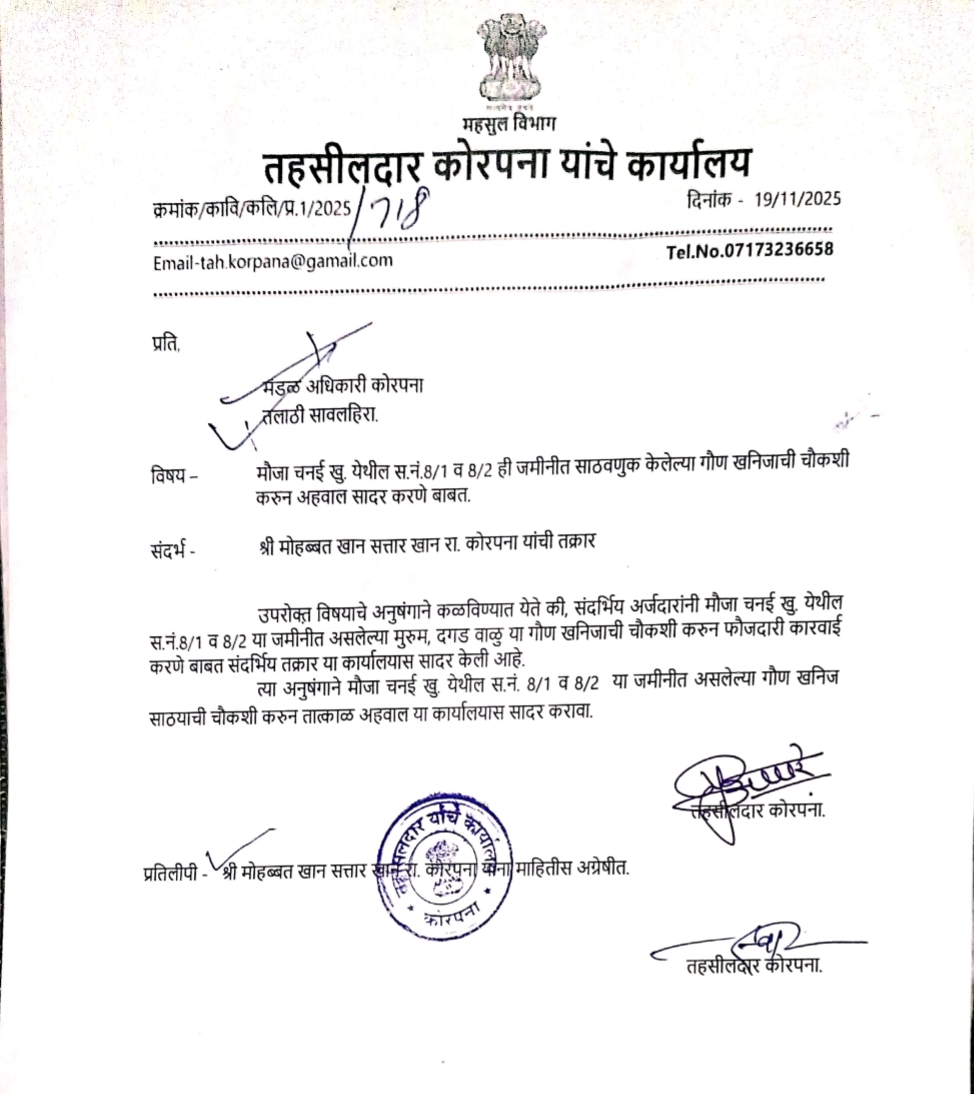कारवाईचे आदेश, मात्र अंमलबजावणी शून्य: अर्जदारांनी केलेल्या तक्रारीनुसार, या जागेवर मोठ्या प्रमाणात गौण खनिज साठवले गेले असून, याबाबत चौकशी करून दोषींवर फौजदारी कारवाई करण्याचे आदेश वरिष्ठ कार्यालयाने दिले होते. त्यानुसार, मौजा चनई खु. येथील स.नं. 8/1 व 8/2 या जमिनीतील गौण खनिज साठ्याची चौकशी करून तात्काळ अहवाल सादर करण्यास सांगण्यात आले होते.